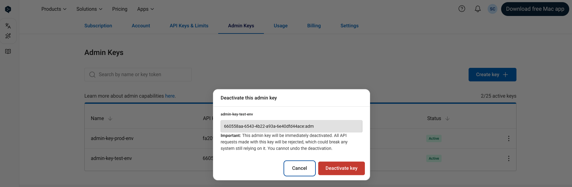 IMPORTANT: An API key will stop working immediately when deactivated. After a key is deactivated, it cannot be reactivated—deactivating a key is permanent!