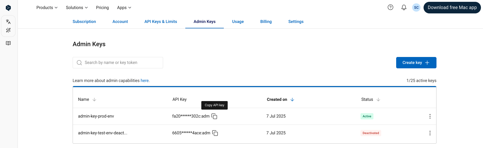 For security reasons, we do not show the full key in the table in the “Admin Keys” tab. Both active and deactivated keys can be copied.