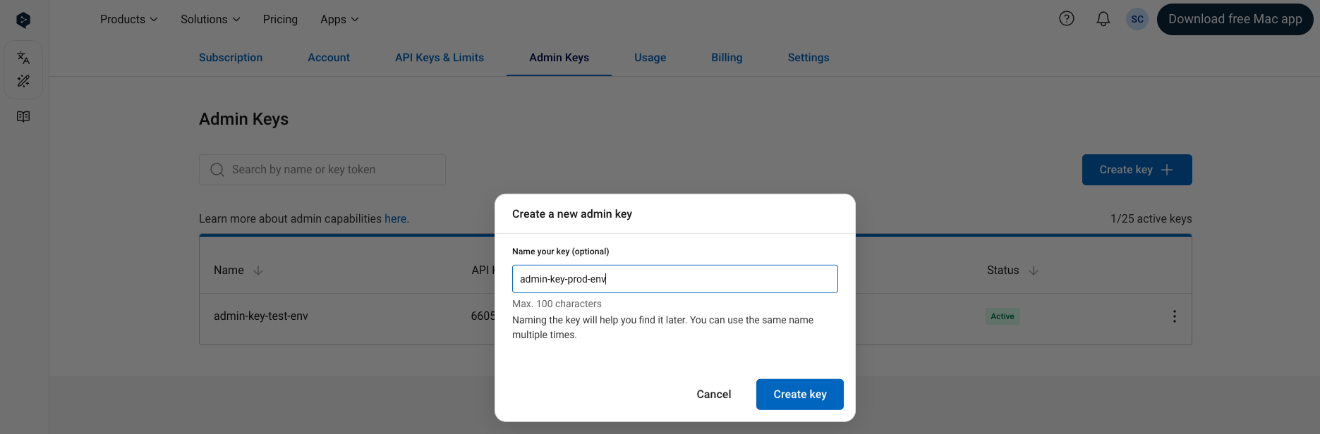 Create a new admin API key by clicking on the “Create Key” button. You can optionally give an API key a custom name during the creation process. If you do not name the key, the name “DeepL Admin Key” will be given to the key automatically. You can create up to 25 simultaneously active admin API keys.