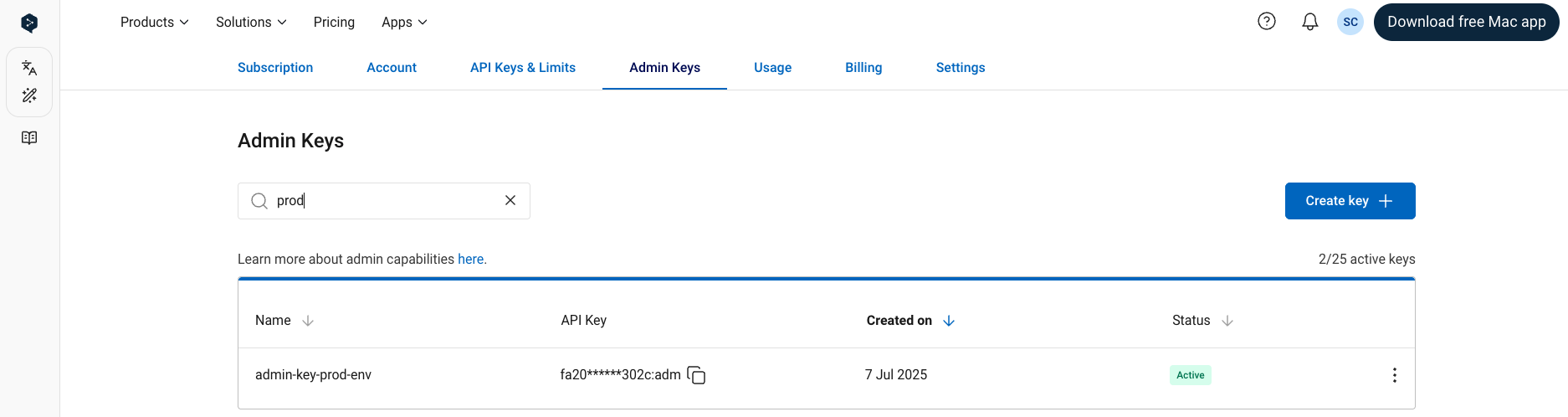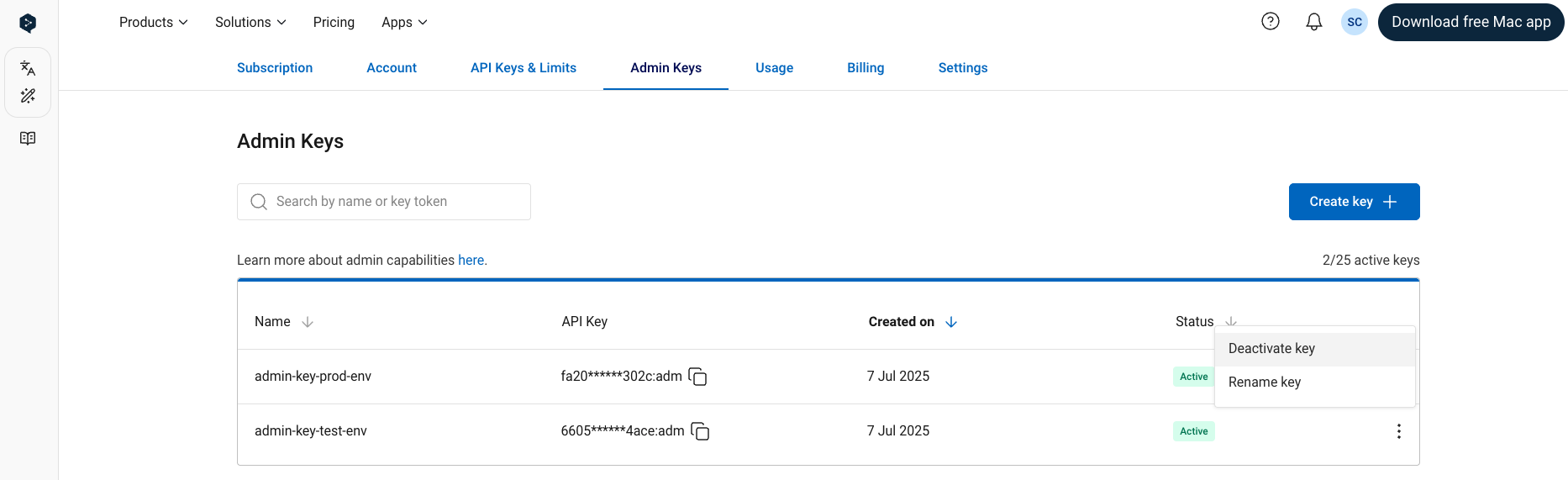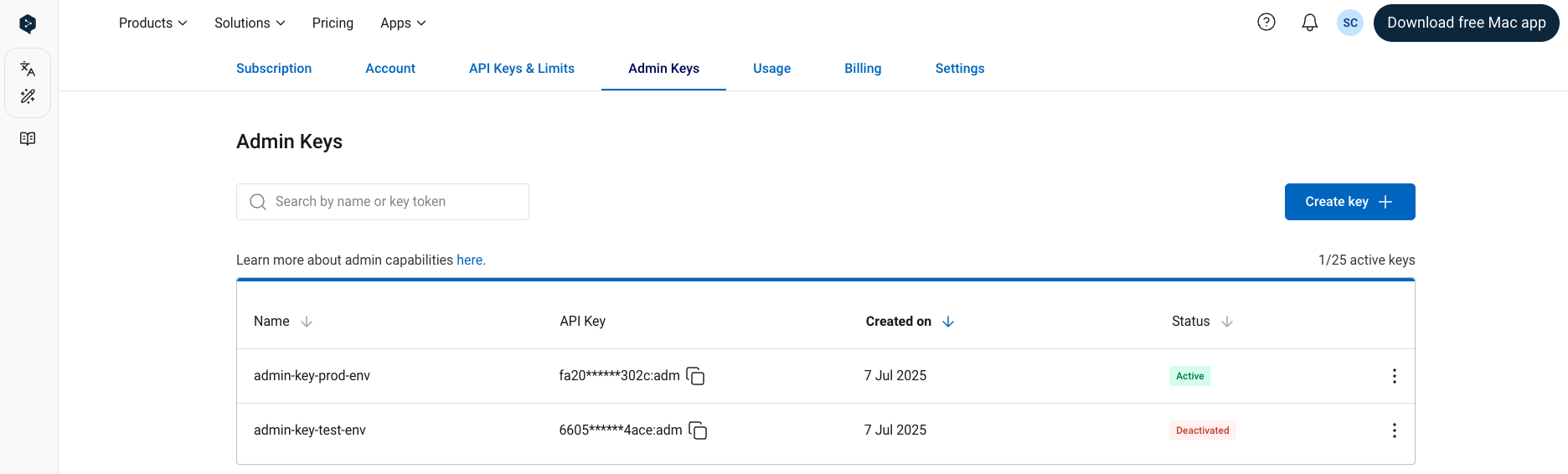 Once the Admin API access has been enabled for your account, you can find and manage your admin API keys in the “Admin Keys” tab when signed into your DeepL API account. It’s possible to have multiple, simultaneously active admin API keys in a single API subscription.