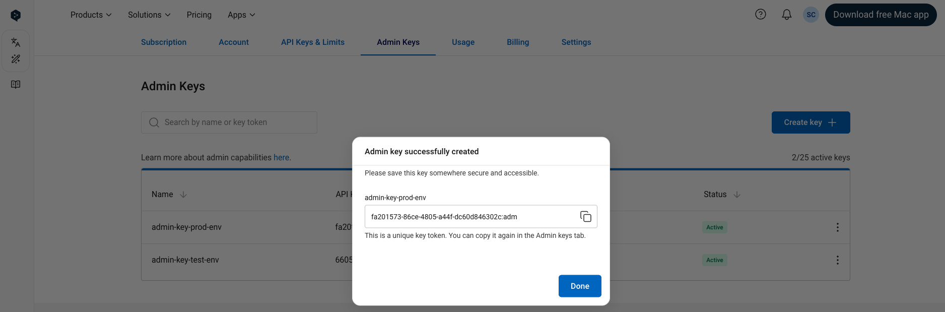 After creating a key, a popup with the newly created key will appear: