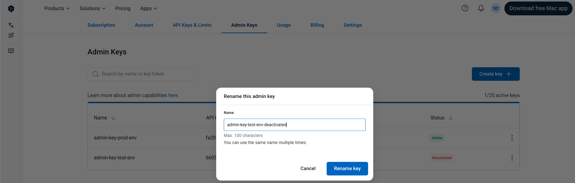 Allows you to edit the name of an API key. Note that it is possible for two keys to have the same name. Both active and deactivated keys can be renamed.